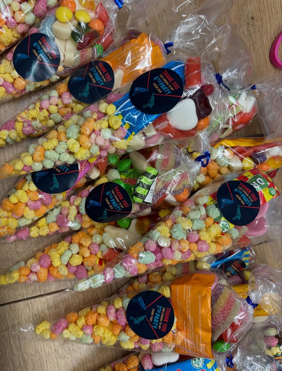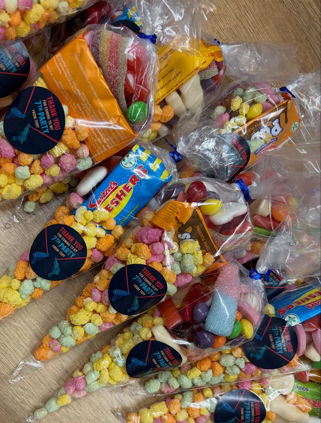 Transform your party favors into a coordinated highlight with the Bespoke Personalised Sweetie Cones & Favor Bags from P&L Boutique. Designed to alleviate the stress of event preparation, these treats are fully customizable to align with your celebration’s unique aesthetic—whether it’s a vibrant superhero theme, a soft pastel baby shower, or a high-action “Laser Tag” birthday as pictured. Each cone is filled with a premium assortment of sweets and topped with a professionally designed, personalized sticker featuring the guest of honor’s name, age, and theme-specific graphics. We pride ourselves on inclusivity, offering the ability to meet individual dietary requirements (such as vegan or vegetarian options) upon request. These hand-assembled favors provide a polished, boutique-quality finish that ensures every guest leaves with a memorable and delicious token of the day.