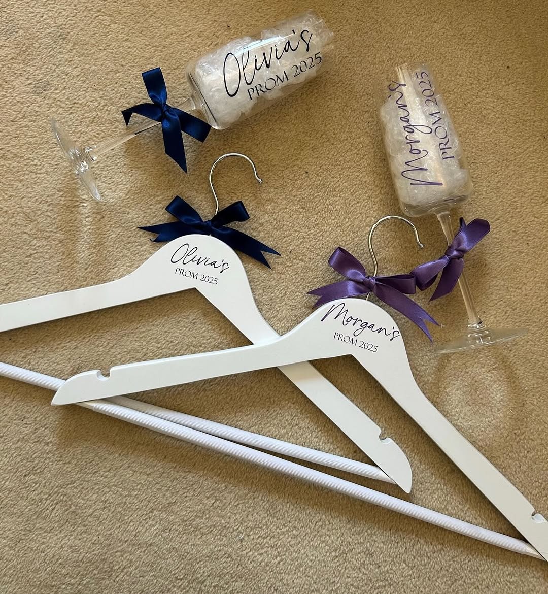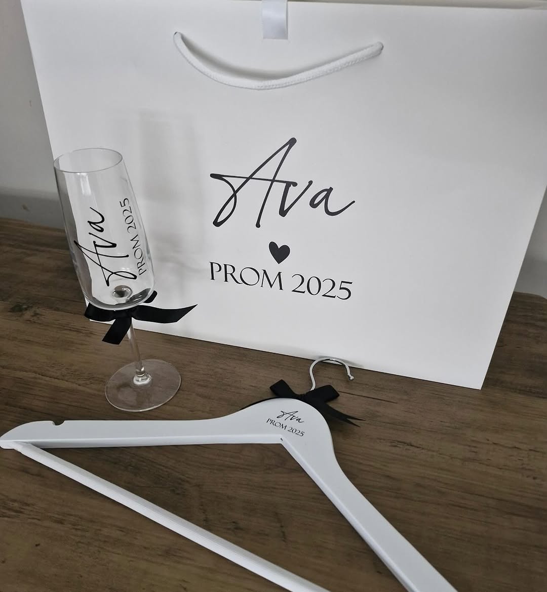 A premium, fully coordinated gift set for prom season featuring a personalized coat hanger, champagne flute, and gift bag.